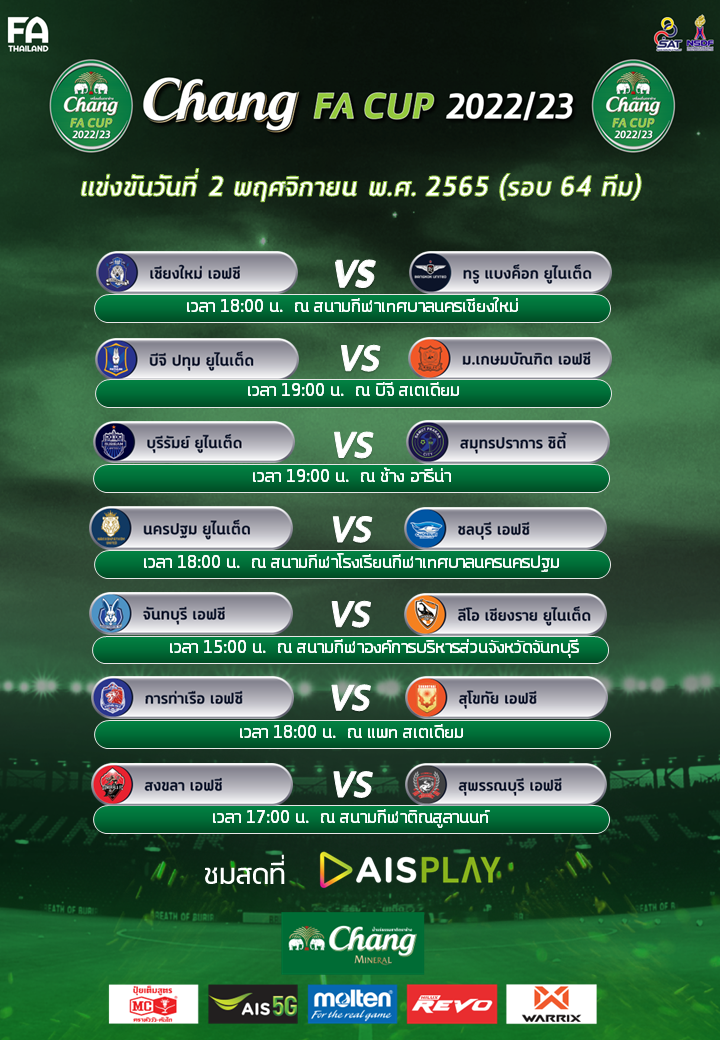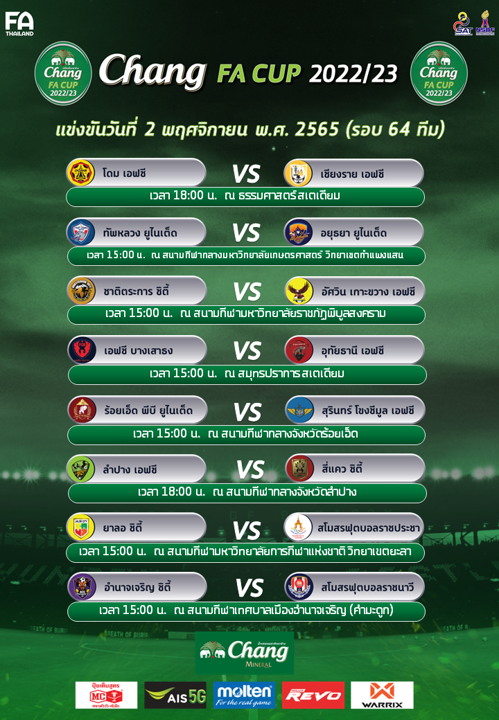 โปรแกรมการแข่งขันฟุตบอล ช้าง เอฟเอ คัพ รอบ 64 ทีมสุดท้าย วันพุธที่ 2 พฤศจิกายน 2565