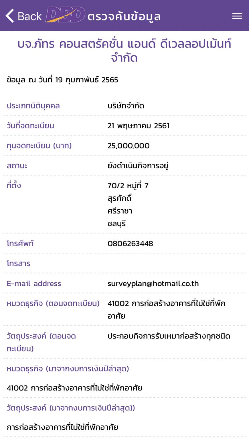จากการตรวจสอบฐานข้อมูลกรมพัฒนาธุรกิจการค้า พบว่า  บริษัท ภัทร คอนสตรัคชั่น แอนด์ ดีเวลลอปเม้นท์ จำกัด จดทะเบียนจัดตั้ง 21 พฤษภาคม 2561 ทุนปัจจุบัน 25,000,000 บาท ตั้งอยู่เลขที่ 70/2 หมู่ 7 ตำบลสุรศักดิ์ อำเภอศรีราชา จังหวัดชลบุรี