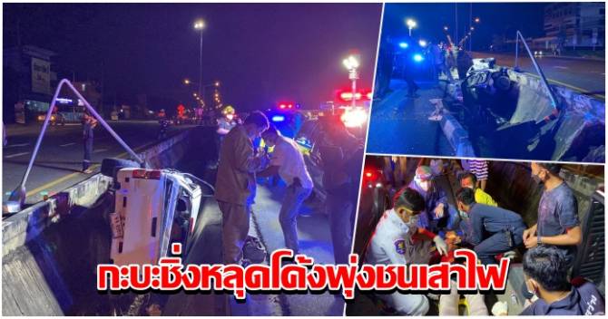 กะบะชิ่งหลุดโค้งพุ่งชนเสาไฟคนขับติดคาซากสาหัส