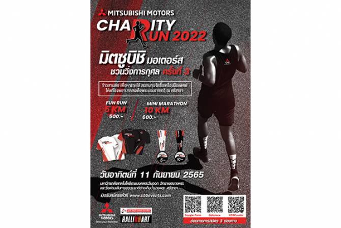 บริษัท มิตซูบิชิ มอเตอร์ส (ประเทศไทย) จำกัด ผู้จัดกิจกรรม ซึ่งร่วมสนับสนุนโดย มูลนิธิ   มิตซูบิชิ มอเตอร์ส ประเทศไทย ขอเชิญชวนนักวิ่งทุกท่านร่วมวิ่งการกุศล ครั้งที่ 3 หรือ “Mitsubishi Motors Charity Run 2022” ในวันอาทิตย์ที่ 11 กันยายน 2565 บนเส้นทางอ่างเก็บน้ำบางพระ อำเภอศรีราชา จังหวัดชลบุรี โดยรายได้ส่วนหนึ่งจากงานวิ่งการกุศลจะนำไปสมทบทุนจัดซื้อเครื่องมือทางการแพทย์ให้แก่โรงพยาบาลสมเด็จพระบรมราชเทวี ณ ศรีราชา