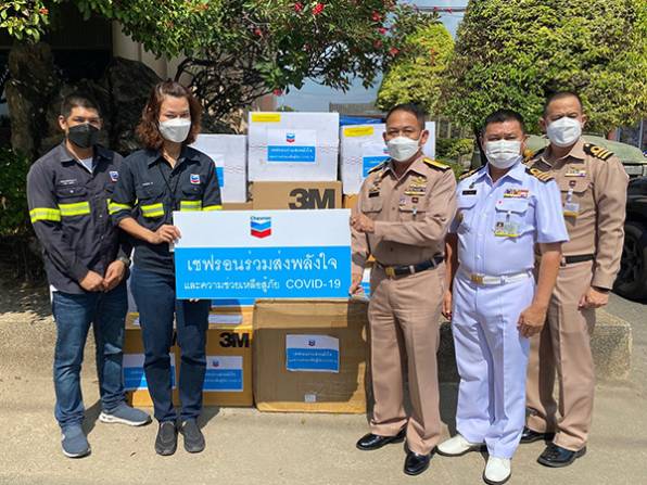บริษัท เชฟรอนประเทศไทยสำรวจและผลิต จำกัด นำโดย นางสาวชณิดา สายะพันธ์ หัวหน้าคลังสินค้าสัตหีบ มอบอุปกรณ์ทางการแพทย์ รวมมูลค่ากว่า 75,000 บาท ประกอบด้วย หน้ากากกรองอากาศ N95 จำนวน 600 ชิ้น หน้ากากอนามัย ทางการแพทย์ จำนวน 10,000 ชิ้น กระจังป้องกันใบหน้า (Face shield) จำนวน 500 ชิ้น เสื้อกาวน์กันน้ำ (PE gown thumps-up) จำนวน 600 ชุด และถุงมือยาง จำนวน 50 กล่อง ให้กับ พลเรือตรี วศิน บุญเนือง (ที่ 3 จากขวา) ผู้จัดการกิจการไฟฟ้า สวัสดิการสัมปทานกองทัพเรือ เพื่อส่งมอบให้กับโรงพยาบาลอาภากรเกียรติวงศ์ ฐานทัพเรือสัตหีบ ใช้ในการรับมือกับการแพร่ระบาดของโรคโควิด-19 ในจังหวัดชลบุรีต่อไป